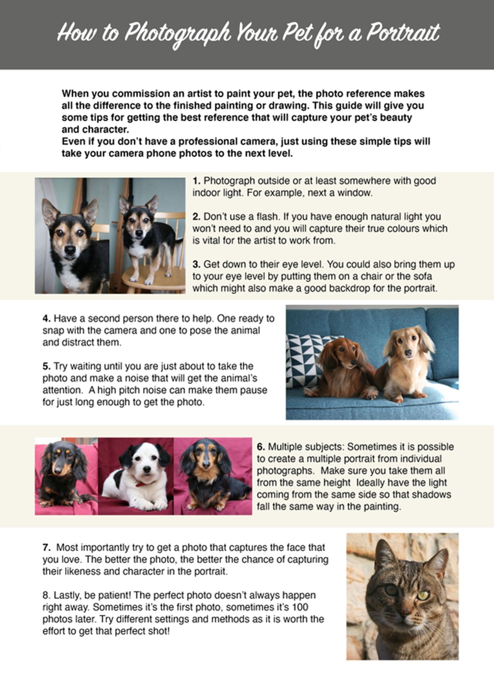 An artist will not need professional quality images to work from, but the photos will need to be clear and show your pet’s key features in detail.